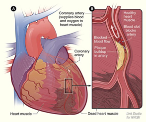 A heart attack occurs when there is death of cardiac (heart) tissue due to lack of blood supply to that portion. This is a result of coronary artery disease. Even though CAD develops slowly over time a heart attack can happen suddenly and cause significant damage. This is because a clot from a plaque in the blood vessels can break off and travel down to smaller arteries around the heart, get stuck and block blood from getting by. The tissue beyond the blockage is left without any blood supply and dies very quickly. This is very dangerous because this can cause serious arrhythmias and pumping problems that can lead to death. |