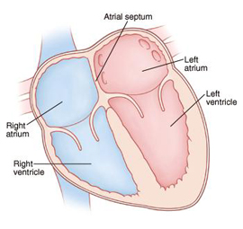 | Before birth there is a natural opening in the atrial septum that allows blood to flow from right atrium to left atrium called the foramen ovale. After birth this opening normally closes. But in some infants this opening remains open and blood continues to flow between the atria, a patent foramen ovale. This opening causes changes in the heart that over time can lead to heart failure. Patient can experience symptoms such as headaches, dizziness or shortness of breath. This opening can also predispose patients to strokes because a blood clot can travel from veins to the right side of the heart through the PFO bypassing the lungs to the left side of the heart and to the head, causing a stroke. A characteristic of PFO’s is strokes at a young age. Surgical closure of PFO protects against these strokes. |